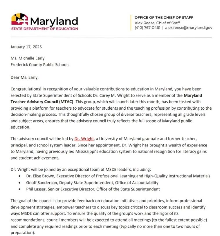 Yesterday, as I sat at my desk, I opened my email and saw the beautiful word, “Congratulations!” As it turns out, I had been selected for the Maryland Teacher Advisory Council, and I would be joining other educators from around the state to enact positive changes in my home state.